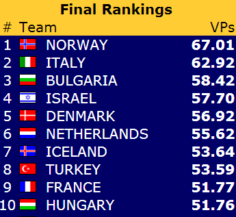 Den gang ble Norge nummer 13 med 237 VP, og var altså omtrent 27 VP fra å kvalifisere seg for VM. I år er det åtte plasser til VM, og dermed er det altså et par VM-plasser til å kjempe om. Sist gang var det drøyt 20 poeng opp til Irland på 8.plass.