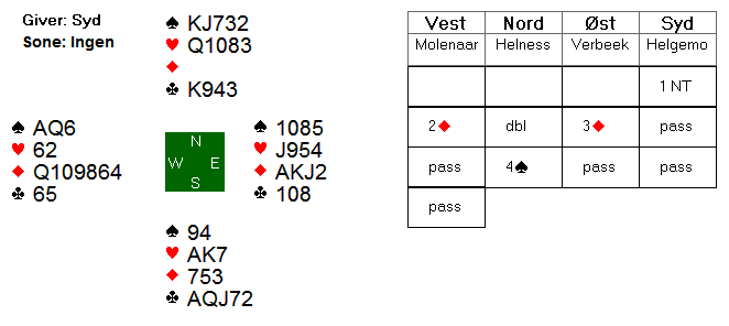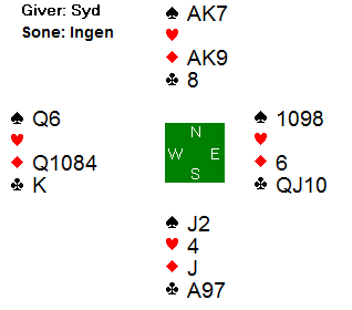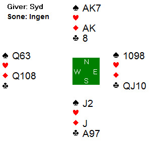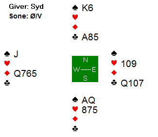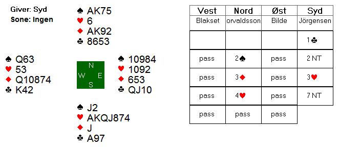 Øst spilte ut singel ruter til esset, etterfulgt av ruter til 10'eren i nord og stjeling i øst. Øst fortsatte med hjerter ess og hjerter til stjeling i nord.