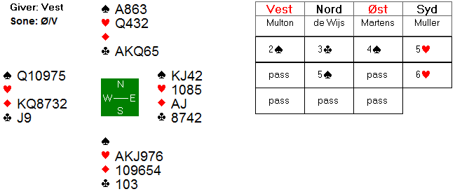 Vest spilte ut en hjerter, og så tidlig at han kunne få kasteproblemer da syd tok alle hjerterne sine. Han kastet derfor så tidlig som mulig en spar og 2 kløvere. Etter 6 runder hjerter var posisjonen som følger: