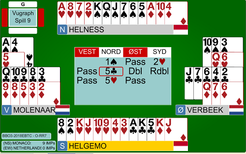Vest så tidlig kasteproblemene sine, og ventet til de to siste hjerterne før han hev ruter 7 og ruter 8. Dermed trodde syd at ruter 9 kunne være god, og hev derfor en spar i bordet. Nå var det ikke lenger noen som trengte å holde på sparen, og islendingen måtte gå en beit.