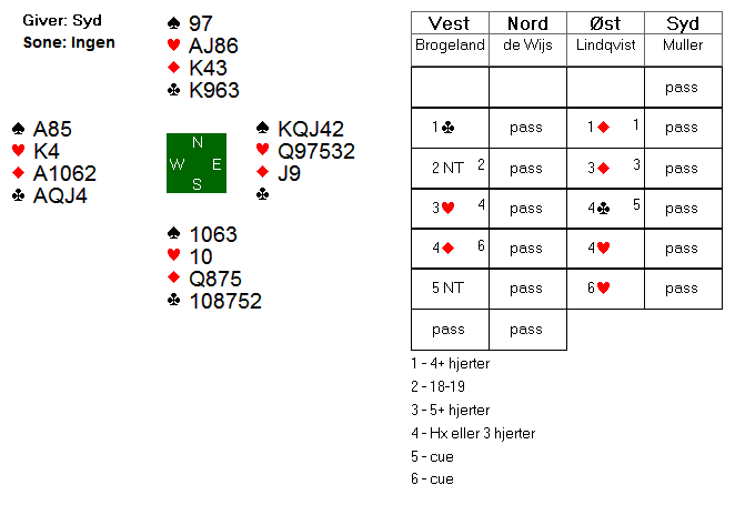 I lukket rom åpnet Lindkvist imed 2 kløver, Brogeland svarte 2 ruter og Øst gjenmeldte 3 kløver, fikk svar 3 ruter men på 3 NT inviterte Boye med 4 kløver og via kontroll 4 ruter ble 5 kløver løftet til lilleslem, 6 kløver. Her var hj  AD beskyttet og 12 stikk bombesikert hjemme for +12 imp.