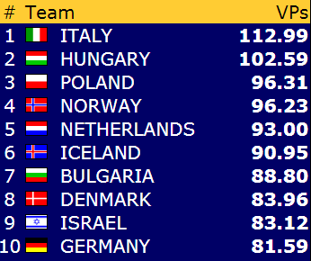 Etter 3 fine seire mot Nederland, Spania og Polen, er Norge tilbake igjen på tabelltopp, 0,08 VP foran Italia:
