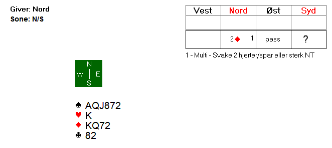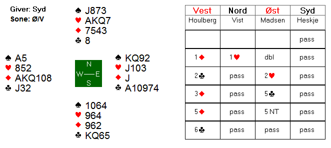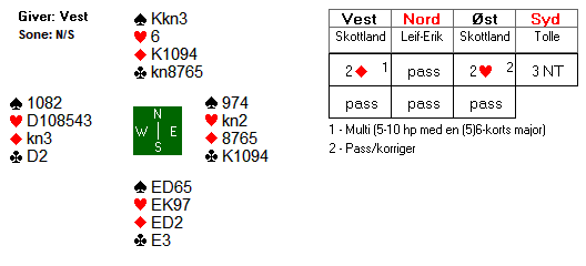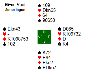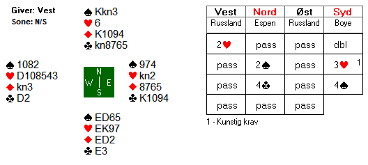 Espen valgte å åpne i 2 kløver på hånden i nord, og da ble det vanskelig for motparten å komme inn. Øst meldte inn 2 ruter, men etter systemet viste dette 4+ spar + en minor. Øst hadde glemt dette, og vest fant aldri ut hvilken minor makkeren hadde, og Espen fikk spille 4 spar for 10 stikk og +620.
