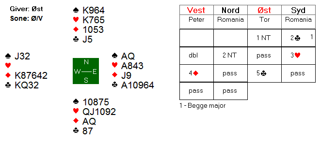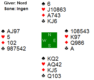 Nå måtte Ulf gjøre riktig i hjerter. Hvis ikke ville øst vinne med dama, fulgt av ny hjerter til esset og hjerter til stjeling for ei beit. Heldigvis stakk Ulf med kongen. Da ble det ti stikk siden ruteren ga de nødvendige avkastene. 620 på bok for Norge.