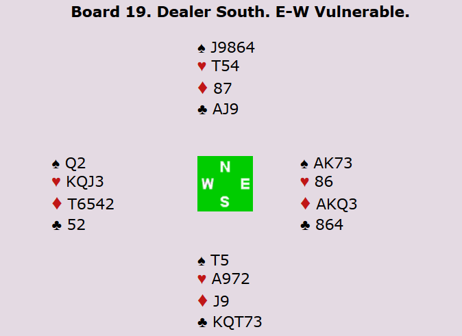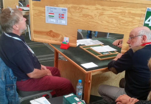 Dette var for øvrig et interessant spill der det altså var om å gjøre å unngå 3 grand. For det norske damelaget meldte Gunn Tove Vist og Torild Heskje den flotte kontrakten 5 kløver, mens ungarerne ved det andre bordet meldte 3 grand med beit. Dermed tjente de norske damene 12 IMP på dette spillet. De leder sin kamp 31-19 før de fire siste spillene.