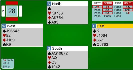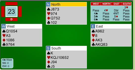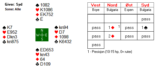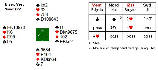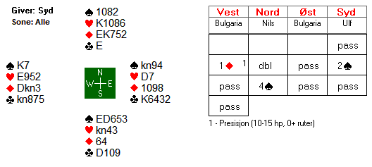 Denne gang ble det ikke riktig. Selv om det ble ei beit i kontrakten, fikk Bulgaria 8 IMP etter å ha meldt og vunnet 4 hjerter ved det andre bordet. I den kontrakten var det ikke mer enn to sparstikk og et trumfstikk å få tak i for forsvaret.