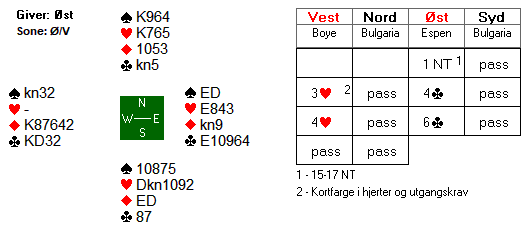 Det endte sågar med to beit og 200 ut. Ved det andre bordet fant bulgarerne 6-2-tilpasninga i hjerter etter at de ikke ble satt under like stort press som Espen og Boye: