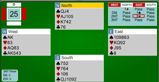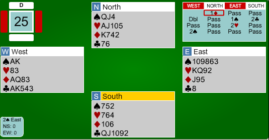 Med sine 21 honnørpoeng valgte han å passe syds ruteråpning, som ikke trengte å inneholde en eneste ruter. Soneforholdene var nok avgjørende for Boyes valg. Med mindre makker har en 5-korts majorfarge, er det 3 grand som er den eneste aktuelle utgangen. Om det står 3 grand kan det være at det er vel så lukrativt å spille motspill og hente sonebeiter i stedet.