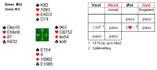 Mot 2 hjerter startet Anders med ruter 10, som gikk til dama hos Marius. Han innkasserte også ruter konge før han skiftet til en liten spar. Anders vant med esset, og skiftet i tempo til liten kløver. Spillefører ba om liten, og Marius vant stikket med dama. Han fortsatte så med en kløver til Anders sitt ess. Spar konge sørget for forsvarets sjette stikk, og sikret beit i kontrakten.