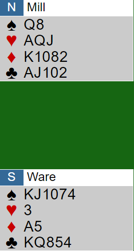 S valgte er ennå bedre plan, hun tok ru A og K og stjal en ruter. Dermed var det V som satt med ruterholdet og ru 7 var et 1- kort trussel. Da trumfene ble tatt ble V på siste utsatt for en posisjonell skvis i ruter og hjerter og måtte blanke hj K. Ru 7 forsvant da fra bordet og hj A og D tok de to siste stikkene.