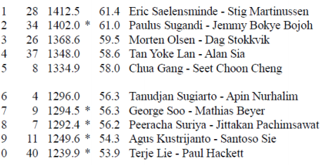 På 7.plass finner vi Mathias Beyer (ex. Kåre K) sammen med Georg Soo fra Filipinene (de har vunnet denne turneringen tidligere), og på 10.plass kom Terje Lie sammen med engelske Paul Hackett. Listen over de beste så slik ut:
