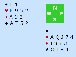 Den eneste lille ruteren du ikke ser er fireren. Enten har makker den, i så fall har spillefører dobbelton og det må være K-Q, eller Q-x, og er det damen dobbel har jo makker ruter konge. Makker kan ikke ha fem ruter da han ville ha spilt ut fireren. Kanskje skal vi ta ett stikk til i ruter? Det er vel ikke helt unaturlig å tenke på å spille tilbake ruter, men det kan fort være veldig feil selv om det kan se ut som vi har bra kontroll med hjerter konge bak bordets (syds) hjerter. Og slik det var burde antagelig vest se for seg at annet faremoment her: