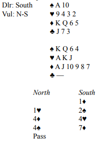 Etter kløver ut til trumf hos syd tas motpartens trumf. Så A-K i hjerter, og hadde damen falt kunne fu forlang resten. Siden det ikke lyktes spilles spar til tieren som holder, spar ess, kløver til trumf hos syd og to store spar fra syd med avkast av nords to gjenværende hjertere. Så avsluttes med å stjele hjerter knekt før det er storeslem til notering!
