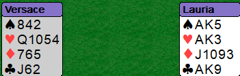 Lauria leste sitsen bra og visste at nord ikke hadde flere ruter samt at syd trolig hadde startet med tieren tredje i spar. Spillefører hadde gitt bort bare ett stikk (i ruter) og ved å spille spar etter den fjerde hjerteren ville nord komme inn. Han kan da ta to sparstikk, men så må han spille kløver. Hvis nord har kløver dame vil han altså etter å ha tatt sparstikkene sine bli tvunget til å spille unna den til bordets knekt, og det er det niende stikket. Så Lauria tok for hjerter 10 og kastet en ruter fra hånden, så spar fra vest.