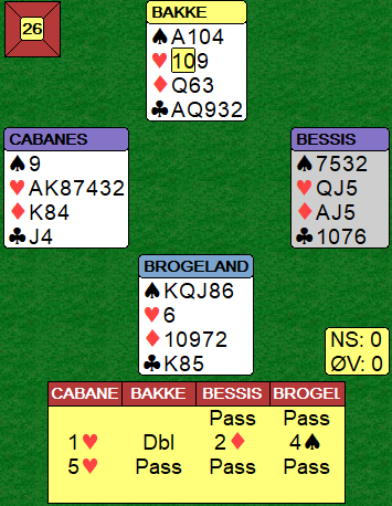 Bakke noterte +1430 og da Drijver spilte sparen på den naturlige måten (kongen først) ble det en bet og +100 til Norge, 17 IMP inn!
