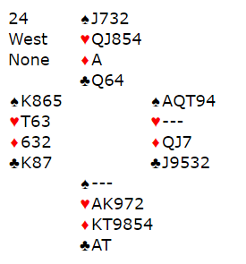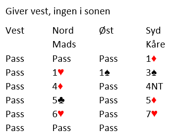 Dette ga 14 IMP til lag Denmark da N/S ved det andre bordet stoppet i utgang! Det var faktisk ikke så uvanlig med utgang N/S, over halvparten av N/S-parene spilte 4 hjerter. Ved mange av de bordene var Ø/V mer aktive, og det ble ikke så lett for N/S. I mange kamper ble det 11 IMP inn for å spille 6 hjerter med tretten mot utgang ved det andre bordet!
