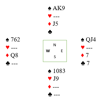 Hvis øst hadde hatt en ruterhonnør, og en, to eller tre ruter ville ikke den tredje finessen vært nødvendig, men om øst har honnør fjerde eller femte må vi over til nord tre ganger. Inne på kløver ess spiller syd en spar som stikkes akkurat over hos nord (for eksempel kongen til esset), så ruter til knekten og kongen. Vest tar sitt kløverstikk og forsvaret har fire stikk. Idet spillefører kommer inn igjen spilles spar knekt til damen (eller nieren til tieren), så ruterfinesse som holder, og det tredje sparinntaket brukes til å komme seg over til nord for den siste ruterfinessen. Spillefører vinner 3+2-3-1= 9 stikk.