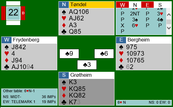 Nei, her skal du utnytte situasjonen, for den utspilte nieren og den informasjonen du har fra meldingene gjør at du har tre bombesikre sparstikk ved å dekke med knekten over syds nier. Se hva som da skjer: