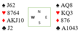Hvis du legger lavt fra blindemann (vest) på utspillet vinner damen stikket, og nord blir sittende igjen med K-10 over vest sin knekt.