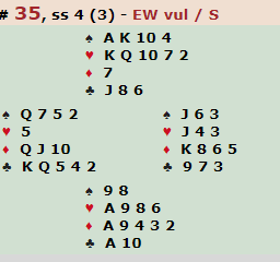 Syd åpner med 1 ruter og støtter makkerens hjerter, vanligvis kun med en enkel høyning, vil jeg tro. Da skal det godt gjøres å tro mye på slem som nord, men om han tråkker til med en Splintermelding (4 ruter) har syd fine verdier. Likevel, det er tynt, han har absolutt ingenting utenom essene. Vel, det er jo faktisk ved første øyekast på hele spillet syds dobbeltoner i kløver og spar som er knallbra her.