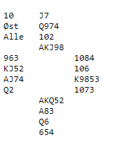 Som du ser er 4 spar en mye bedre kontrakt, men det er ganske naturlig å komme i 3 grand slik det fleste har definert sitt system. Kun ett par i disse fire puljene meldte 4 spar, Ole Berset og Bjørn Olav Ekren. Siv Thoresen og Tolle Stabell var i 3 grand og noterte +690 etter hjerterutspill fra vest.