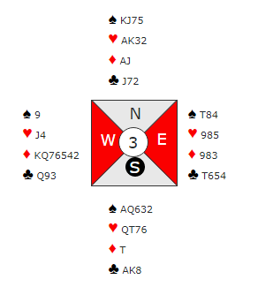Dette er en relativt enkel lilleslem å melde og vinne i hvilken som helst majorfarge, men de aller fleste havner i sparkontrakt med ni trumf til sammen. Å melde storeslem er litt vel hardt, og i sparkontrakt blir det bet om man ambisiøst går på til syv-trinnet. Men 7 hjerter står faktisk så lenge hjerterfargen er uten taper, i 7 spar blir det bet!