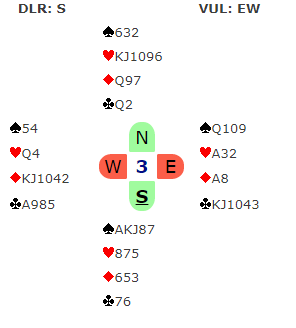 Kun noen få Ø/V par hadde funnet 3 grand. I den kontrakten ser det vanskelig ut med spar konge i utspill. Men om kløveren tippes og spilles for fire stikk vil syd få alvorlige problemer i de to siste kløverrundene. Altså kan 3 grand vinnes, men det må gjettes bra. Syd må holde tre hjerter og kan følgelig kaste en. Så må han i fjerde kløverrunde enten gi slipp på en spar eller en ruter. Hvis han kaster ruter kan ruter dame spilles fra vest, og det ruller opp den fargen, knekten faller! Og om syd kaster en spar har han ikke lenger nok motspillstikk til å bete 3 grand. Men spillefører må gjette. Syd kunne jo godt ha utstyrt seg med K-x i ruter i stedet, og dermed ha blanket ruter konge…