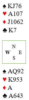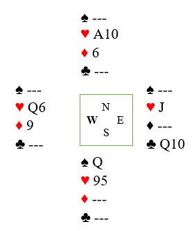 Det blir nemlig en enkel skvis mot vest i diagramsituasjonen. Idet spar dame spilles må vest gi opp hjerteren, eller kaste ruter 9 slik at nords ruter blir det tolvte stikket. Men da spillefører sløvet idet vest kastet hjerter og selv kastet hjerter fra nord fikk vest beten for ruter 9. Vest gjorde i alle fall det han kunne i denne sluttpossen, han holdt å¨det han så han måtte holde, ruter 9.