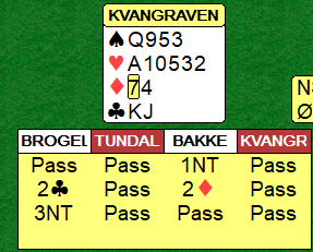 Så kom det andre norske oppgjøret, og mot Tundal-Kvangraven startet Brogeland med å spille godt i 4 spar som endte med fem trekk, +650 og et bra spill.