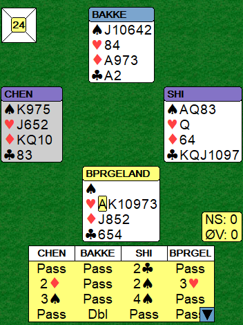 Da Brogeland hadde til en melding i andre runde var ikke Bakke nådig. Straffedoblingen av motpartens frivillige meldte utgang ga +300.
