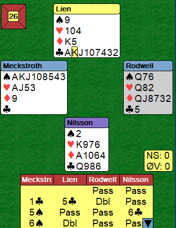 Ved begge bord ble kontrakten 6 spar doblet av vest, og nord spilte ut kløver som vest stjal. Meckstroth brukte ikke mer enn sekunder på å se hva spillet handlet om, mange inntak til øst i trumf. Så han trumfet med spar 8 og spilte ruter. Nord føk opp med kongen og spilte hjerter, nokså hjelpsomt motspill. Meckstroth ville nok uansett ha vunnet kontrakten da han har tre inntak i spar hos øst, både damen syveren og sekseren er inntak! De brukes til å presse ut syds ruter og hente godspilte ruterstikk. Det ble tolv stikk og en massiv +1660.