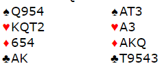 Et klønete påkast spør du meg, for om spillefører tror på det (at vest faktisk har A-K) så kan han spille på dobbel-squeeze ved å gi opp mellomruterne hos syd mot slutten! Han spiller seg da ned i denne posisjonen:.