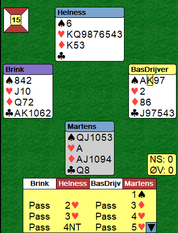 Så gikk det litt slag i slag med mulige svingspill. Brink-Drijver (Ø/V) «brant» en ganske bra slem, men det var bare 30 hp til sammen, dog med hver sin gode femkortsfarge i minor.