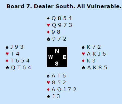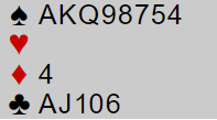 Med slikt blir det gjetting. Tolf kort i de sorte fargene, og massevis av topphonnører i fargene! Her er det meningsløst å snakke om honnørpoeng, disse kortene har et enormt stikkpotensiale. Du tenker før noen har meldt at her kan det stå alt mulig, kanskje storeslem, men om makker har ingenting, eller de feilaktige kortene uten tilpasning behøver det ikke være så flott. Det skal imidlertid lite til hos makker før det står slem.