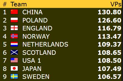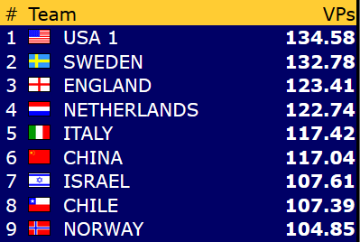 Vi ønsker damene lykke til videre i mesterskapet! Allerede i neste kamp kan deres jakt på flere IMP og vinnerpoeng følges direkte på BBO. Motstander er USA 2, og Norge stiller med Marianne - Ann Karin og Bodil - Liv Marit.