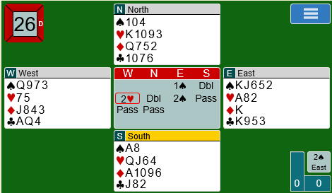 Jeg er usikker på hva som er forskjellen på pass og 2 spar over nords dobling, men øst bør i alle fall ikke avgi den minst oppmuntrende meldinga i den situasjonen.