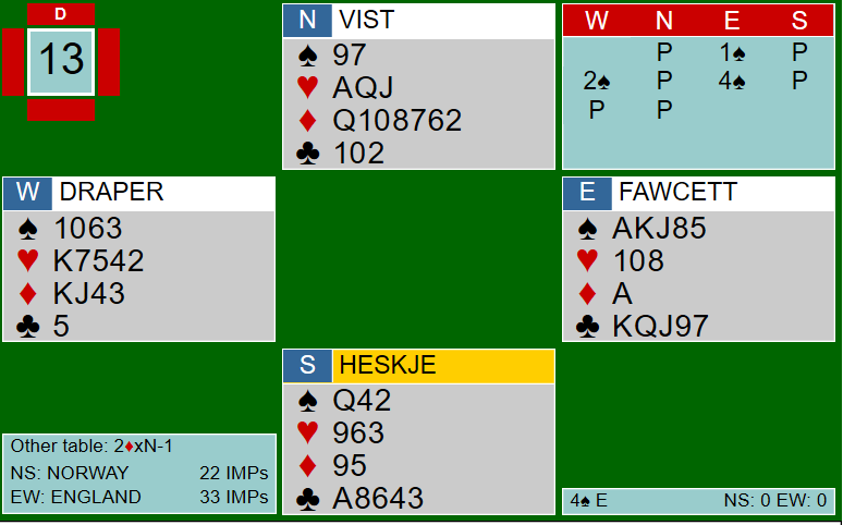 Hj 2 kom ut til 10-er dame og liten. Vest skiftet så til sp K som vant og sp J som Øst stakk over for å ta nok en høy spar og til slutt den 4 til røff av Nord mens Vest fikk saket to små rutere. Ann Karin tok så for ru K og spilte reu 10 til ru D, ru A og stjeling av Punch. Innspilt som hun var tok hun for hj K og fortsatte fargen til bordets konge.Ruter opp igjen stakk Vest med kl D og fridde seg med hj 9 som f, 3 hj var cuebid og 3 NT fra or Boye gjenmeldte 3 ruterNord stjal med kl 9. Kl A måtte så gi det 5. stikket, og bare tre bet kostet dermed 500. Ved det andre bordet spilte Ø-V 2 spar med 8 stikk så Skottalnd vant 12 imp på spillet.
