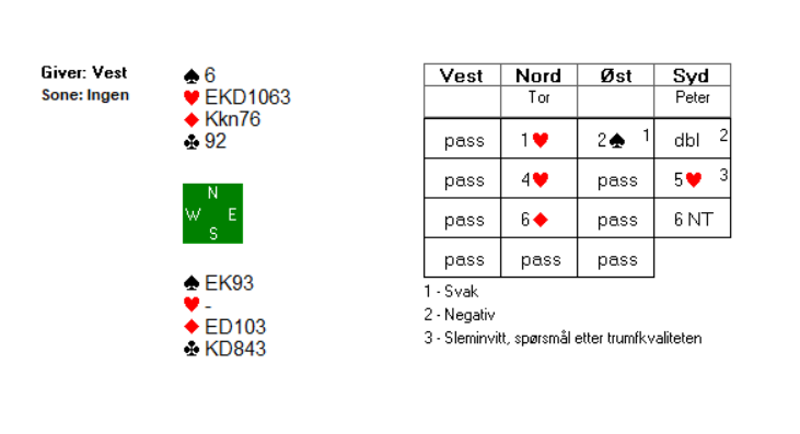 Peter var nok litt usikker på betydninga av 6 ruter, men det bør kanskje bety at makker har en solid hjerterfarge og tar med seg å vise sidefarge i ruter på vei til 6 hjerter. I så fall vil vet be makker om å velge mellom 6 ruter og 6 hjerter. I kampen mellom Norge og Sverige i åpen klasse endte begge bordene i 6 ruter, om enn på litt forskjellige vis. Peter på sin side valgte å melde 6 grand. Da han fikk se bordet ønsket han nok heller å være i minorslemmen: