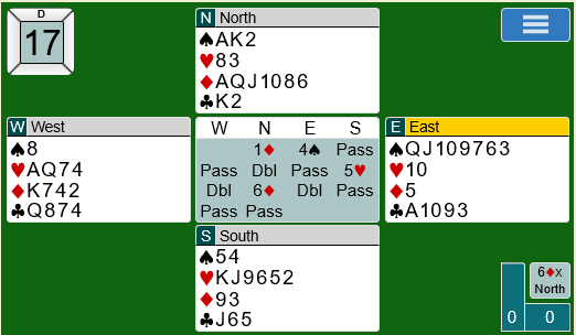 Her ser vi hva som er det store problemet ved å doble i praksis. Man må forvente at makker melder, og man har jo egentlig ikke tilpasning til hverken kløveren eller hjerteren. Dermed har man i praksis meldt 6 ruter på egen hånd om ikke makker mot formodning skulle klare å passe.