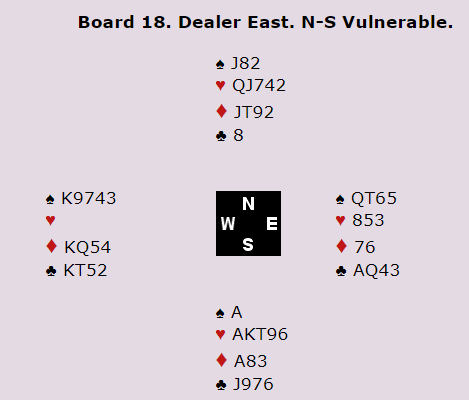 Jeg tror det riktige er å fastslå at makkers litt uventede utspill er en singelton omtrent hundre av hundre ganger. Hvorfor vil han ellers blindt spille ut en umeldt farge etter at egen side har meldt og støttet hjerter? Det var overaskende å se at mange på syd sin plass forsøkte en stor hjerter da de var inne på trumfesset. Da føk kontrakten hjem i full fart siden hele spillet så slik ut: