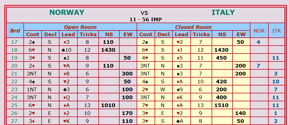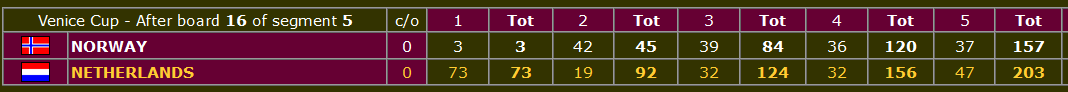 I Bermuda Bowl er USA 1 i trøbbel mot England som har med (litt norske) Artur Malinowski. Kina ligger også under i sin kamp som er mot Polen. I øyeblikket ser det altså ut til at det kan bli en hel-europeisk semifinale i den klassen! Men for all del, det er 32 spill igjen så mye kan skje fortsatt.