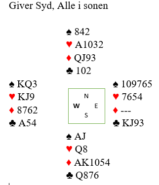 Pass fra Vest. Tormod valgte da å åpne med 2 grand som viste minst 5-5 i minor. Kanskje litt for dårlig spillestyrke, men når man bruke «Romerske» 2- åpninger (2 hj, 2 sp og 2 NT lover tofargehender under styrke for åpning 1 i farge) må man nesten bruke dem i aktuelle tilfeller. Øst hadde til opplysende dobling og Per valgte i stedet for minorpreferanse eller å melde 3 hjerter å passe for da kan jo makker velge sin beste farge selv. Ellers skal makker med svak hånd normalt bare preferere i makkers farger. Men her passet også Vest og tvang Nord til å melde 3 kløver. Da den ble passet rundt til Vest kom det derfra opp rødt doblingskort og pass rundt. Hj A kom ut og Eriksen kunne ikke oppnå særlig mange stikk med den sure sitsen som var. Fire doblete beter kostet 1100 ut!