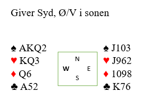 Men flere meldte forskjellig, bl.a. Ove Gundersen (V)- Magnus Larssen (Ø) der Magnus valgte å passe i åpning bare 9 hp, men stor spillestyrke- det går aldri pass rundt): Dermed fikk Ove åpne med Multi 2 ruter og fikk svar 2 hjerter som betyr at Øst vil stoppe der om makkers åpning er av typen «svake 2 hjerter». Men her gjenmeldte Ove 2 NT som etter deres system viste en 22-24 hp grandhånd. Det inspirerte Larssen, han overførte først til spar 3 hj= 5+ spar) og etter 3 spar fra Gundersen hoppet han til 6 ruter så makker kunne velge kontrakt. Med best trekkverdi i major valgte Ove spill i 6 spar. Men her er jo situasjonen at trumffargen er litt tynn, 3-2 imot kan gå bra med hva om det sitter 4-1 eller 5-0 imot? Ove startet sitt trumfspill med å ta sp K men da Nord i neste runde meldte utsolgt var det prutselig to tapere om uavvendelig bet. Men flere hadde lidd samme skjebne så det ble delt bunn for dette resultatet. Hvordan hadde du spilt trumfen? Bare spar til esset fulgt av ny til 9-er godt nok om Nord legger lavt.