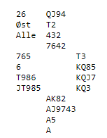 Øst åpnet ved mange bord med 1 grand (15-17). Idet motparten åpner med en sterk grand, er det ikke så lett å komme i utgang. Og det er vel heller ikke ofte egen side har utgang, men i dette tilfellet er det gode muligheter både i 4 hjerter og 4 spar!