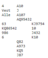 Nermo (vest) spilte her mot Henning Lauritsen (nord) i runde 3. Vest åpnet med 3 hjerter og Lauritsen meldte 4 kløver. syd (Johan C. Skattum) sa 4 hjerter - kontrollmelding - og nord gikk på til slemmen 6 kløver.