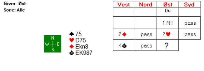 2 ruter var overføring til hjerter og 4 kløver viste minst 6-kortsfarge i hjerter, kortfarge i kløver og sleminteresse. Hva ville du meldt i øst over 4 kløver?