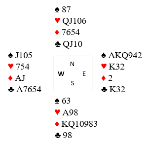 Det handler om å unngå at nord får komme inn slik at hjerter kommer gjennom, for hjerter ess befinner seg mest sannsynlig hos syd. Gullkortet her er ruter knekt som bør være nok til at en erfaren spiller kjenner igjen poenget. En god start er å stikke med ruter ess og spille ruter knekt med det samme, og på det kortet kastes en kløver fra øst! Etter den starten er det enkelt, kløveren kan godspilles og det blir elleve stikk.