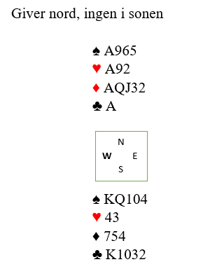 Begge på syds plass var i 4 spar. Der Håkon Kippe var spillefører hadde vest (Våge) meldt inn 2 hjerter etter 1 ruter (nord) og 1 spar fra syd.