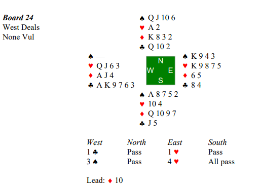 Kommer dere i ruterkontrakt er spørsmålet hvor høyt dere satser. Med 4-3 tilpasning i spar var det to par som endte der, en med betelass etter hjerter ut og en med 13 stikk med ruter ut. Store utslag altså, problemet var at trumfen satt 4-2 imot og hjerter ut må slippes to ganger for å klare kontrakten. Da får du 11 stikk men trumfer du er du på en måte «trumfmatt» allerede. Meldeteknisk er problemet å få avdekket at Nord har svært lang ruterfarge og at Nord har god tilpasning er sterk og renons i hjerter! Vinnerparet klarte seg slik: