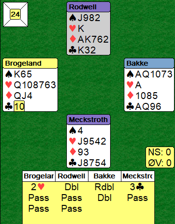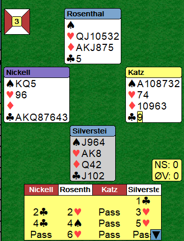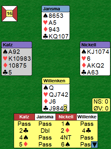 Ingen andre kom i storeslem, flere var i 6 ruter, ved ett bord hoppet Øst innpå med 2 hjerter, Syd overmeldte 3 hjerter (krav) og Vest slang seg på med 4 hjerter etter en styrkevisnede dobling fra Nord. Da var det verre å nå helt ut, men får Syd også meldt 5 hjerter som renons er det kanskje mulig.